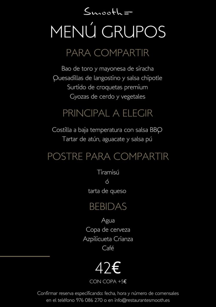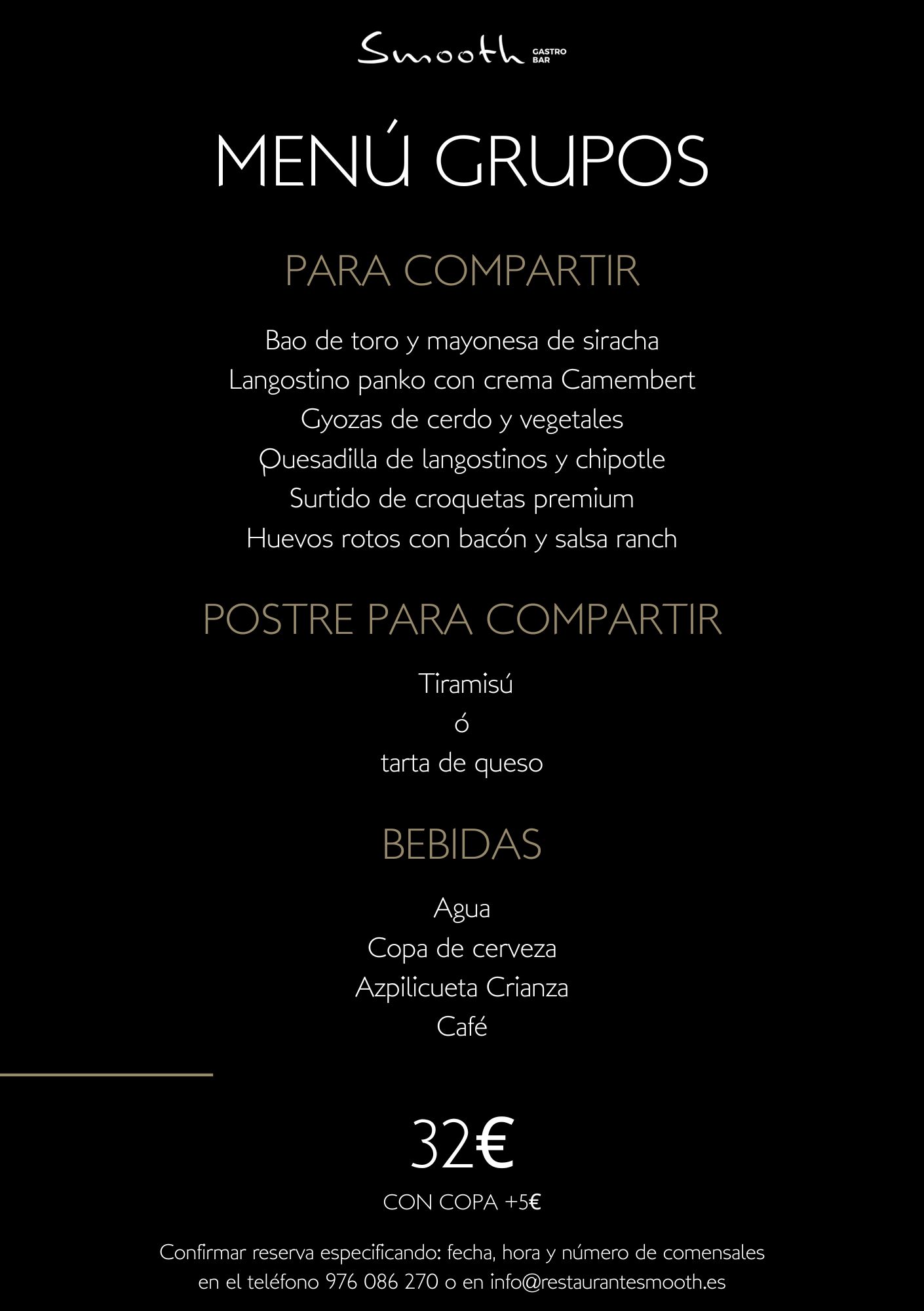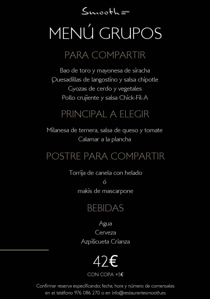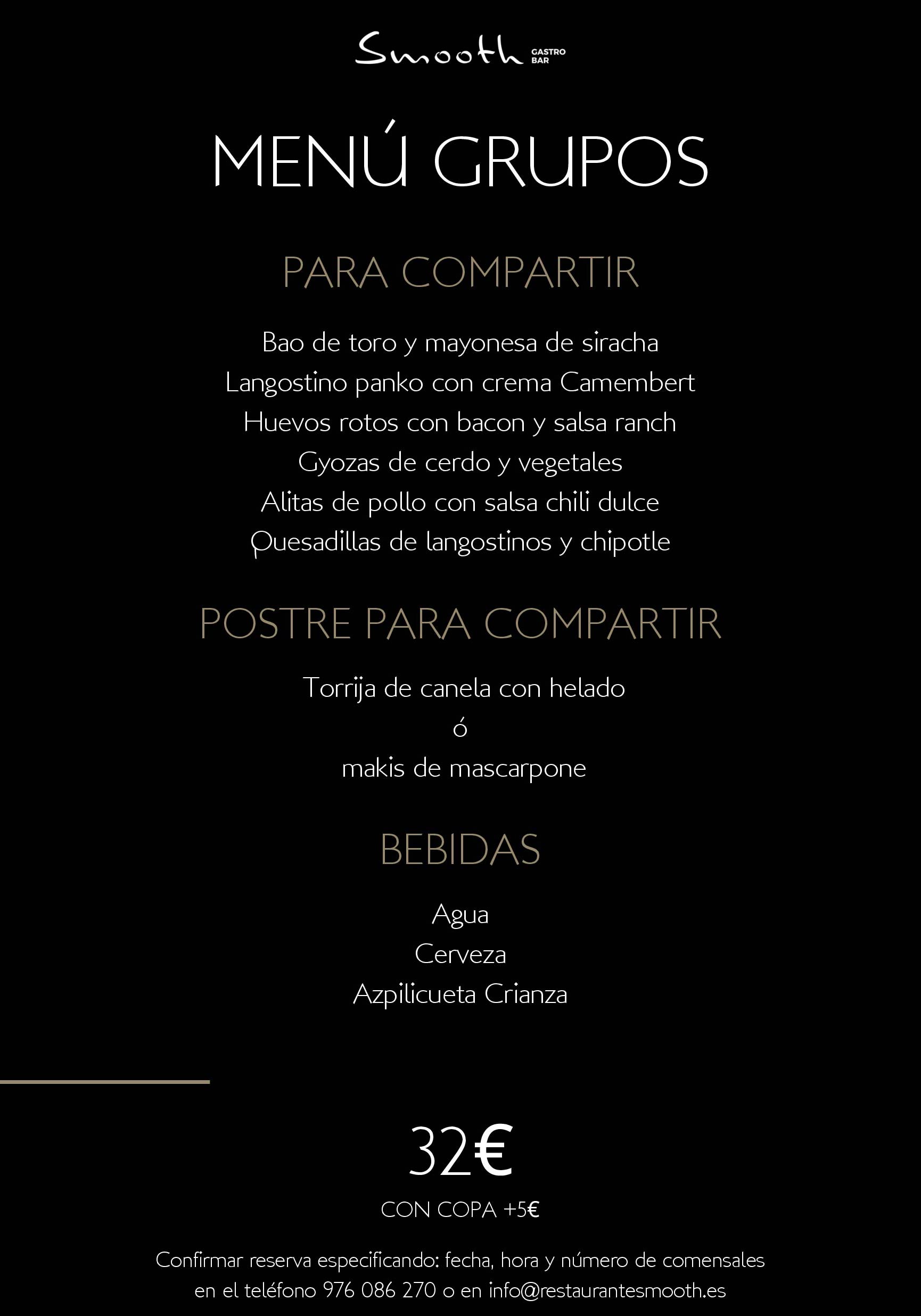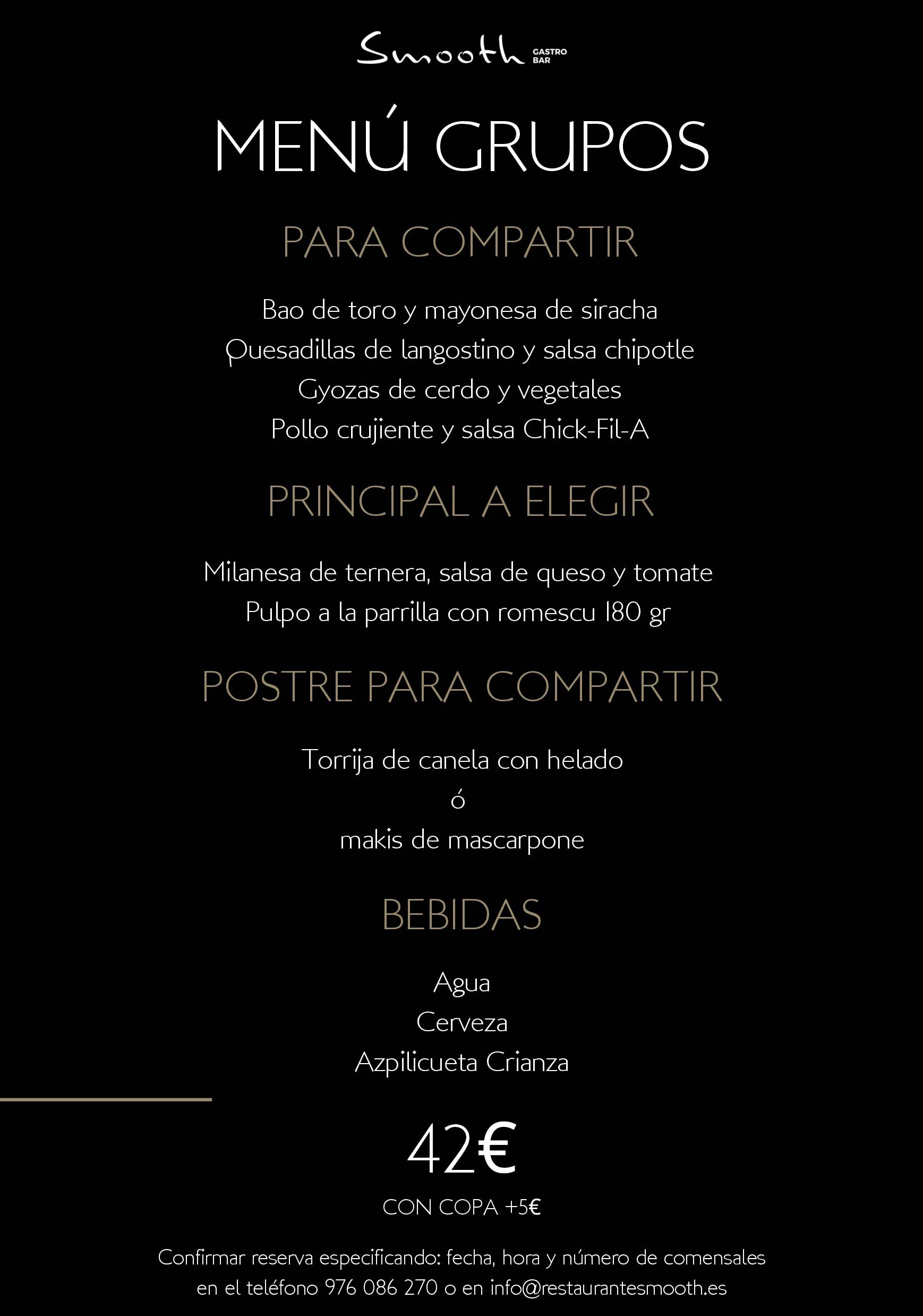 Descubre nuestros menús personalizados para grupos * Reserva mínima para 4 personas Para reservas de más de 8 personas llama al 976 086 270 o escríbenos a info@restaurantesmooth.es Haz tu reserva de grupo Descubre nuestros menús personalizados para grupos * Reserva mínima para 4 personas Para reservas de más de 8 personas llama al 976 086 270 o escríbenos a info@restaurantesmooth.es Haz tu reserva de grupo
